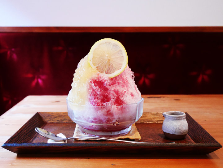 夏の間はかき氷も楽しめます。 一番人気の「桃ワイン」は、手づくりの桃ジャムとワインシロップのあいがけで、中にはヨーグルトアイスと寒天が隠れています。ピッチャーに入ったワインシロップで味の濃さを調節できるのもポイントで、深いワインの風味が感じられる「大人のおやつ」です。