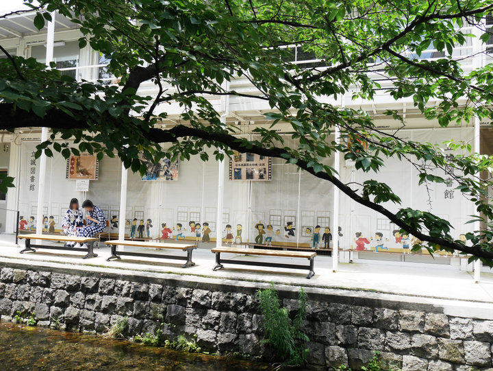 阪急河原町駅から木屋町通を北へ3分、やがて見えてくる白い建物が立誠図書館です。 水辺のベンチ席では、コーヒー好きたちがのんびりと時を過ごしています。 壁を飾るのは、昭和時代を彷彿させる小学生たちを描いたイラスト。かつてはここが学校であったことを思い起こさせてくれます。