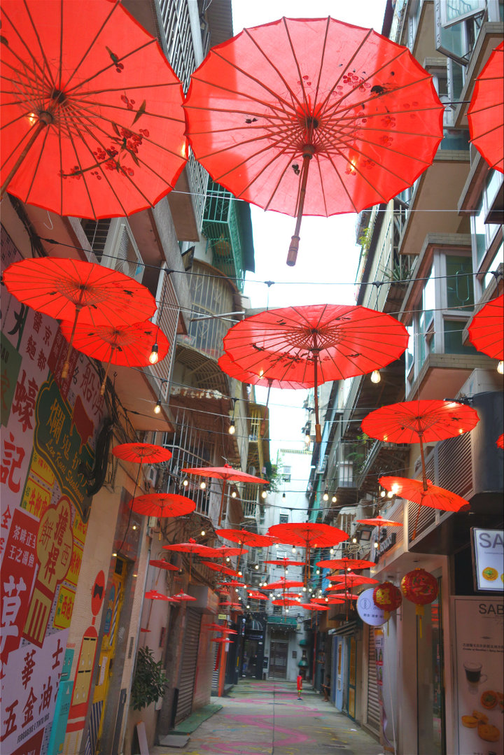 マカオは路地と坂道が多いところ。一瞬、迷路に迷い込んだ錯覚に陥ることがあるけれど、それもまた楽しいもの。小さな街だから、迷子になる心配はありません。マカオ観光の中心、セナド広場の近くで、空いっぱいにまっ赤な傘が広がる通りを見つけました。 最近は日本各地でも催されるようになった「アンブレラスカイ」はもともと、ポルトガルのアゲダという小さな町で芸術祭の一環として始まったもの。ポルトガル文化の影響が今も残るマカオでは、カラフルな洋傘ではなく中国傘が広げられています。その下で地元の人や子供たちがのんびり過ごしているのもいいですね。
