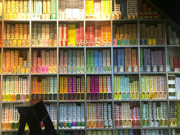 店内には数百種類もの缶詰がぎっしり! 一つひとつのデザインが可愛くて、どれを買ったらいいのか迷ってしまいます。おすすめはツナ、イワシ、タコを使ったもの。シンプルなオイル漬け、ガーリック風味、トマト味、スパイス入りなどがあるので、お好みのデザインと味付けから選ぶといいでしょう。日本語の説明書きがあり、1個400~700円程度なので、おみやげのまとめ買いにぴったりです。