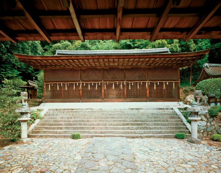 創建時代は不明ですが、神社建築として日本最古のものとされ、「古都京都の文化財」のひとつとして世界遺産にも登録されています。本殿の蟇股(かえるまた)は、京都醍醐寺、平泉中尊寺金色堂とともに藤原時代の三名蟇股と呼ばれる貴重なもの。