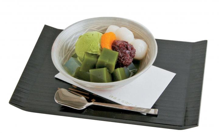 江戸時代から茶業に携わっている宇治でも有数の老舗茶舗「伊藤久右衛門 (いとうきゅうえもん)」。宇治本店にはひと息つける茶房があり、抹茶ゼリーやアイス、白玉などがたっぷりで、濃厚な抹茶蜜をかけていただく「抹茶あんみつ」をはじめ、季節のパフェや、ぜんざい、茶そばなど、本場の宇治茶を使った豊富なメニューがそろいます。