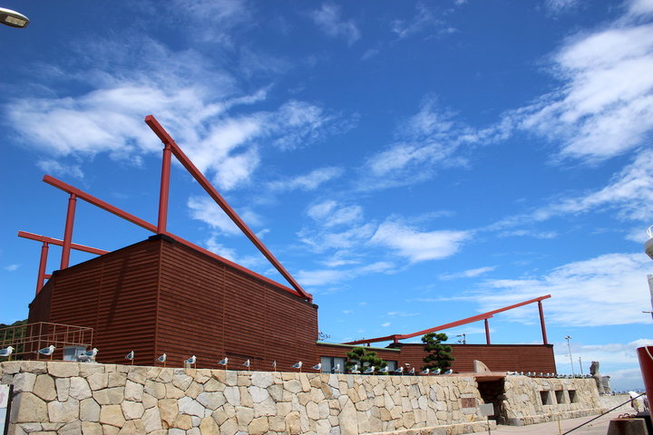 海沿いの堤防に展示されている立体作品「歩く方舟」。旧約聖書にあるノアの方舟から着想を得たアート作品です。4つの山を持った方舟が、海を渡っていこうと歩いていくさまが表現されています。空や雲、海に溶け込むような白と青の着色が印象的。瀬戸内海の風景に不思議と馴染んでいる、象徴的なアート作品です。