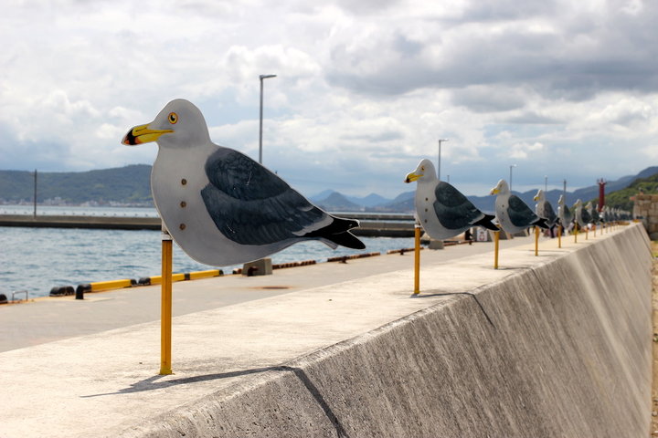 海岸沿いを歩いていると、防波堤や防潮堤にたくさんのカモメたちが並んでいる様子が視界に入ってきます。これは「カモメの駐車場」という名前のアート作品。女木島に吹いている目にみえない風のかたちを、カモメの向きで可視化したもの。この島の象徴的なアート作品のひとつです。