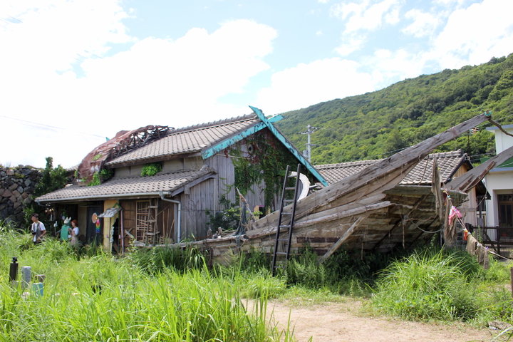 この島の独特な景観を作り上げている石垣「オオテ」。その内側へと歩みを進めていくと、「家船(えぶね)」というアート作品が姿を現します。 古代から近世まで、東アジア一帯には、船で漂流しながら海上生活を営んでいる漁民の家族がいたそう。瀬戸内海では、その船を「家船」と呼んでいたとのこと。このエピソードを手掛かりに、海沿いにある古民家に船首などを取り付けて「家船」の姿に作り上げたのがこの作品です。 建物の内部は、そのあとの家船がどうなったのかという架空の物語を想定。複数の若手アーティストたちによって共同制作されています。