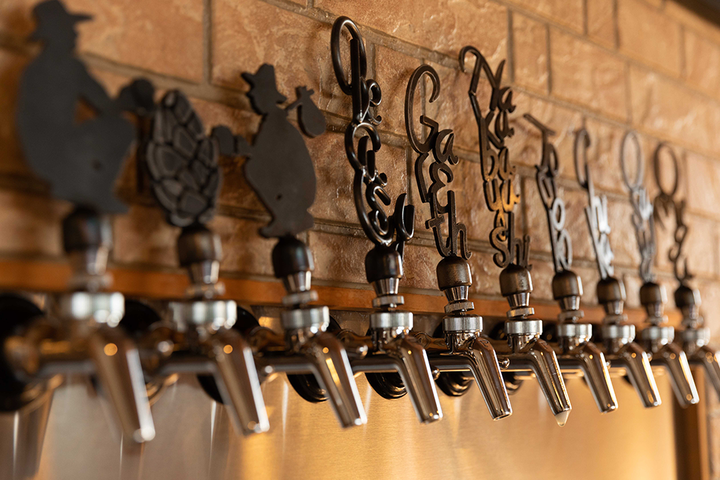 常時取り換えられる12種のうち、ほとんどが自社醸造のビール。ロゴマークと社員の名前が刻まれたタップハンドルに、「チームギャレス」の絆が感じられる。