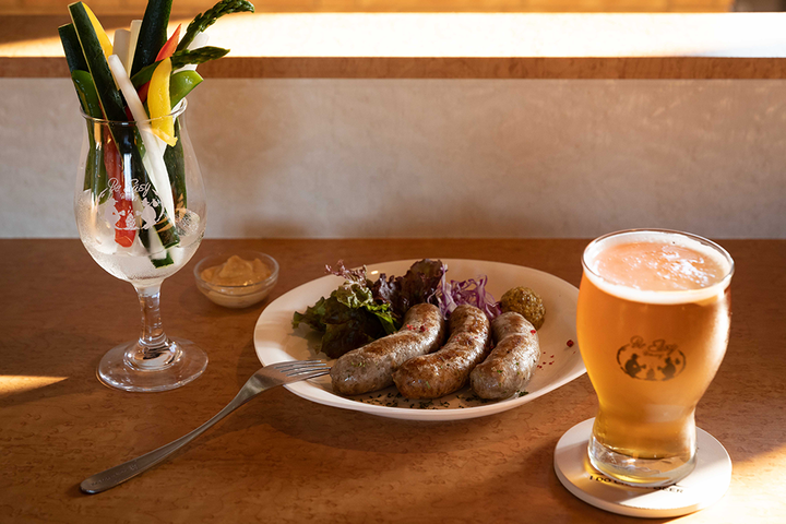 料理のメニューは数ヵ月ごとに変わる。左は「野菜スティック 味噌マヨディップ」650円、中央は「3種の自家製ソーセージ」950円。