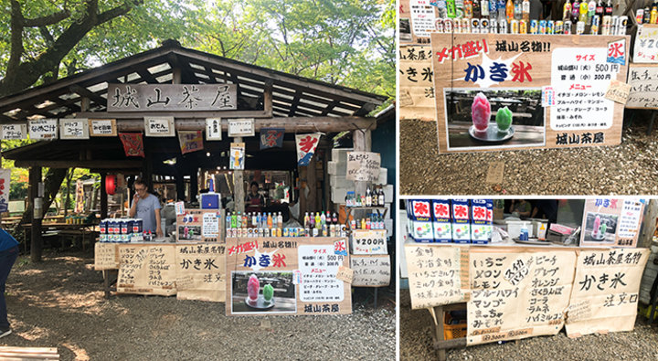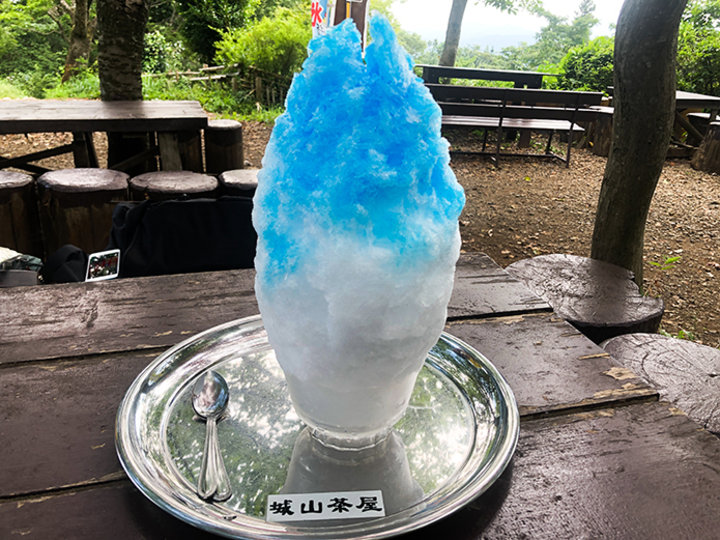 高尾山頂からは約1時間ほど、整備された歩きやすい道を行きます。たどりついた先に見えてきたのは、登山者の疲れを癒す城山茶屋と、飛び込んでくる『メガ盛り かき氷』の文字。 夏場にはなんと嬉しいメニューでしょうか。写真を見るとなかなかのボリュームです。実際に頼んでみると・・・