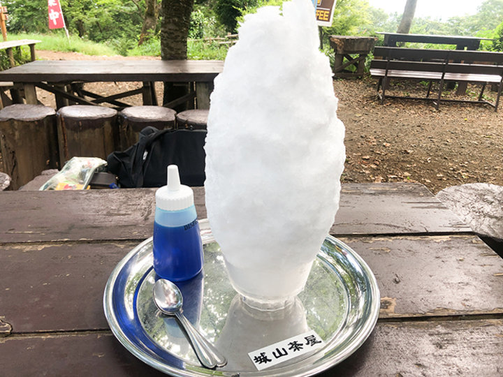 「お待たせ!」と渡されたかき氷は、想像以上の高さ。まさしく山のようにうず高く積もった氷には何もかけられておらず、別添えでシロップがついてきます。 ボリュームたっぷりなので友達とシェアするのがオススメ。おいしいひと時を堪能して涼を取ったら、下山しましょう。まだまだ体力が残っていれば元来た道を戻って景色を楽しむのもよし、小仏峠を経て小仏バス停へ下るルートもあるので安心です(小仏城山からバス停まで約1時間)。