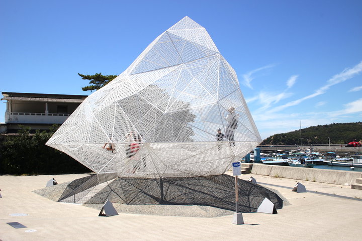 大小27の島々で構成されている直島町。その「28番目の島」というコンセプトのアート作品が「直島パヴィリオン」です。三角形のステンレス製のメッシュを約250枚も使用した、白いまゆのようなかたち。内側に入って遊ぶこともできます。ただ通り過ぎるだけでなく、地元の人びとや旅行者たちが気軽に立ち寄って交流が生まれることが意図されています。 見慣れた景色が違ってみえるようになるのもアートの楽しみのひとつ。夜はライトアップされ、昼とはまた別の雰囲気が楽しめますよ。