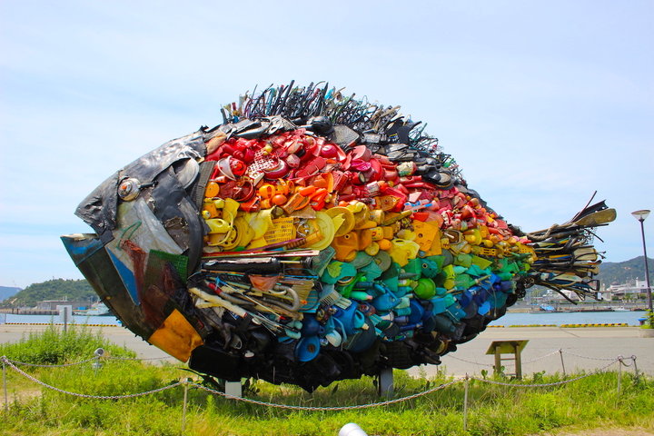 もう1つの玄関口である岡山の宇野港にも、魅力的なアート作品がいくつも展示されています。 写真の作品は、「宇野のチヌ」(淀川テクニック)。宇野の周辺にあったゴミや不要品を集めて作った巨大な魚のチヌ(クロダイ)です。もともとは捨てられていたものを集めて、カラフルで生命力あふれる作品に仕上げています。すぐそばには「宇野コチヌ」という、チヌの子どもバージョンも。