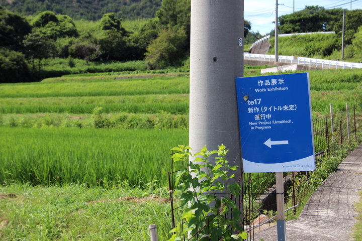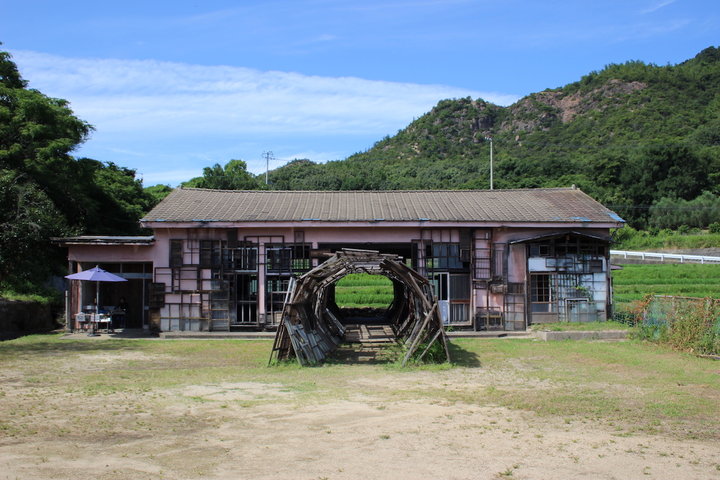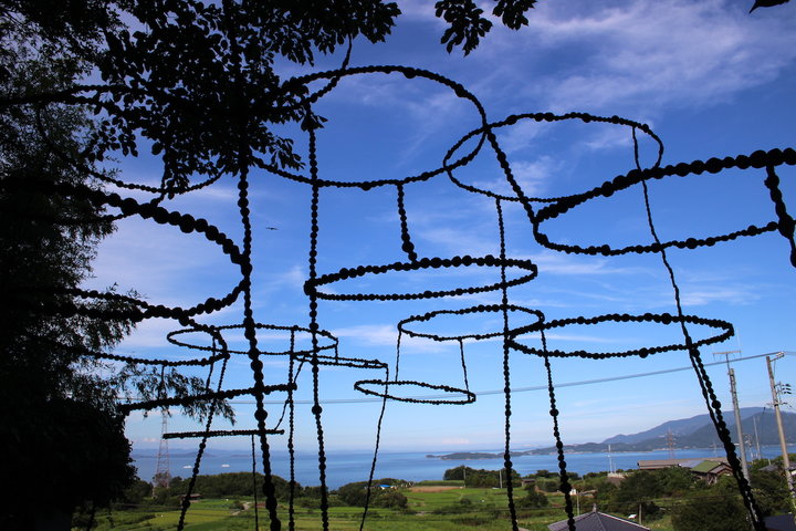 円形の彫刻をつなぎ合わせたアート作品「空の粒子/唐櫃」(青木野枝)。神社の広場、かつてのコミュニティの拠点だったところに、当時の賑わいを取り戻すことを意図して設置された作品です。空を丸く切り取る円が、空を見上げるきっかけにも。 目の前には海や棚田の風景が広がる、豊島の原風景と響き合うようなアート作品です。
