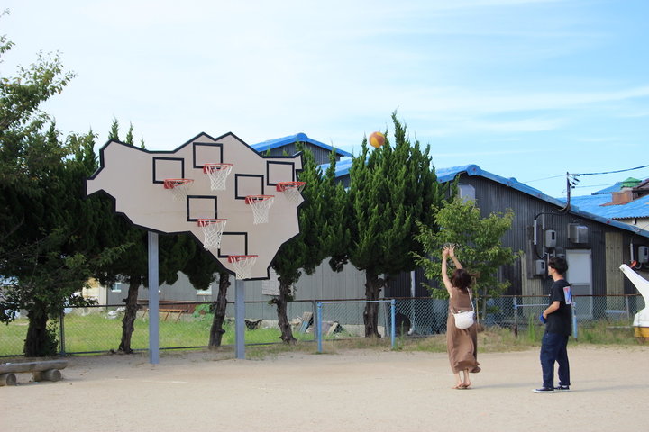 スペインのアーティストである、イオベット&ポンズの「勝者はいない-マルチ・バスケットボール」。豊島のかたちを模したボードに、いくつものリングが設置されています。この場所に住む人びとや訪れる人びとが、それぞれ思い思いにバスケットボールを楽しめるようにとの意図が込められている作品。 ボールも用意してあるので、実際に遊ぶこともできますよ。