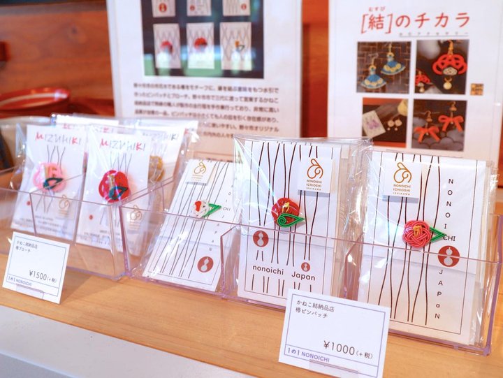 物産コーナーでは、野々市市の物産や地元で人気の菓子などが揃います。 その中でオススメは、第1回野々市ブランドに認定された「かねこ結納品店」の椿の水引アクセサリー。野々市の市花木である椿をモチーフに、縁を結ぶ意味を持つ水引で作ったピンバッチとブローチは、熟練の職人が全て手作りしている自信作。野々市市のお土産に購入してみてはいかが。