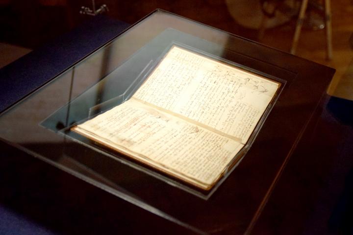 レオナルドの生きた16世紀には、「人間が空を飛ぶ」なんてことは思いつきもしない時代でした。レオナルドはそんな常識を破ろうとします。 この展覧会の目玉のひとつ『鳥の飛翔に関する手稿』には、膨大な量の鳥の飛翔の観察記録や、解剖学・建築・水力学などの分析がまとめられています。それは、バードウォッチングという類のものではなく、いかに翼を動かすと高く上昇できるのか、墜落しないにはどうしたらいいのか、といったことが記された、人工の鳥(=飛行機)の構造と操縦法の研究でした。 “人間が空を飛べるはずがない”というのが常識だった時代に、人間が飛ぶ夢を描いた。その常識の壁を壊した瞬間と言われているのが、この手稿です。 手稿(ファクシミリ版)は見開きごとに解説付きで壁沿いに配置され、また、手帳自体も展示されているので、間近でじっくりと眺めることができます。