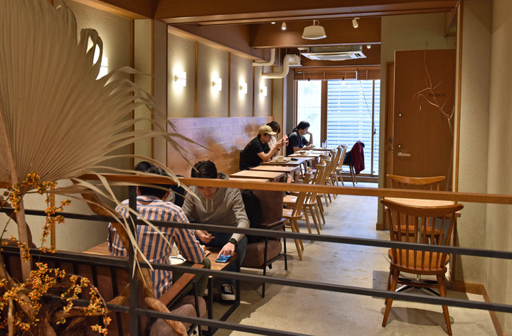 店内は奥行きがあり、木とタイル、コンクリートの内装が、あたたかみを保ちながらもスタイリッシュな居心地のいい空間を作り出しています。さっと飲みたかったり、電源を使いたかったりするなら1階で、ゆっくり過ごしたいなら上に行ってみましょう。