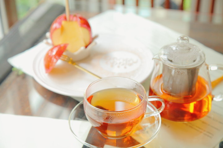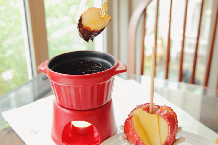 高級ビターチョコを使用したチョコフォンデュも楽しめます。りんごの酸味とチョコの甘み、苦味がほどよく絡み合い、後を引きます。りんご飴と紅茶を一緒に味わうのもおすすめ。紅茶の芳醇な味わいによって、りんごの風味がますます豊かに広がりますよ。