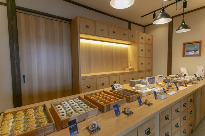 店内に入ると上品な和の佇まい。端正な桐ダンスの上に、季節によって変わる和菓子や定番の商品が並びます。デザイナーとコラボしたスタイリッシュなパッケージのものもあり、ついつい贈り物にも買いたくなるものばかりです。