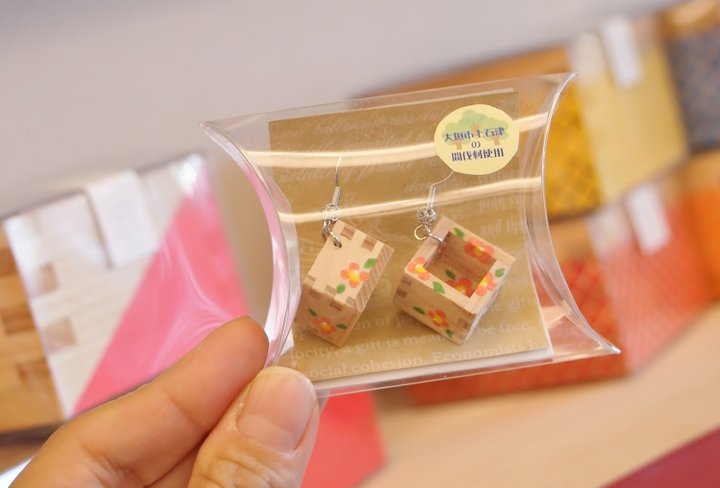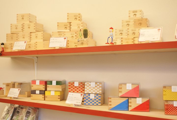 お店の壁面も、枡を組み合わせて市松模様にディスプレイ。枡の中に飾りなどを入れることができる楽しい壁面インテリアです。枡を使ったさまざまな商品も並んでいて、かわいい焼印やペイントが施された枡はデザイン的にもとってもおしゃれ。小物入れなど、いろいろな使い方をして楽しめそうです。