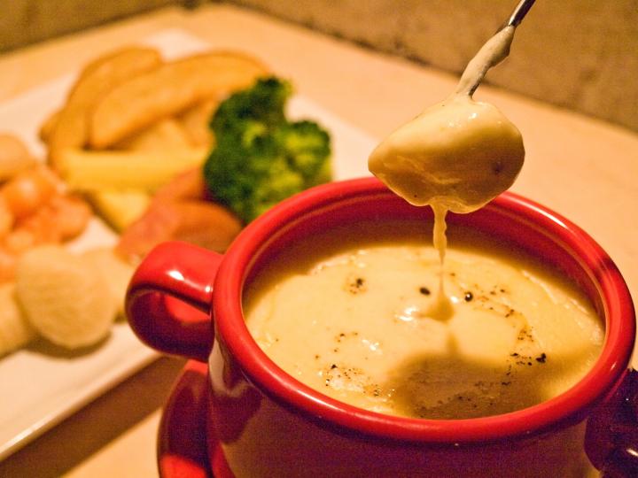 「チーズフォンデュ」(2人前1944円)。具はバゲット、ニョッキ、うずらの卵、ホタテ、フライドポテトなど。もちもち食感のニョッキとチーズの組み合わせが最高