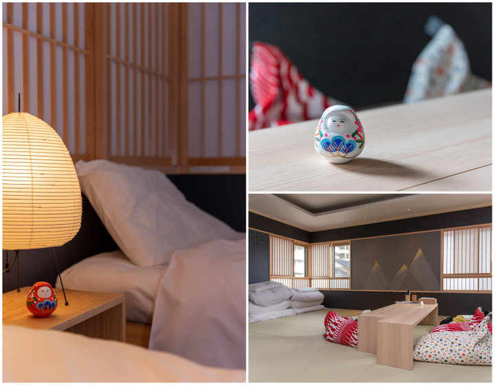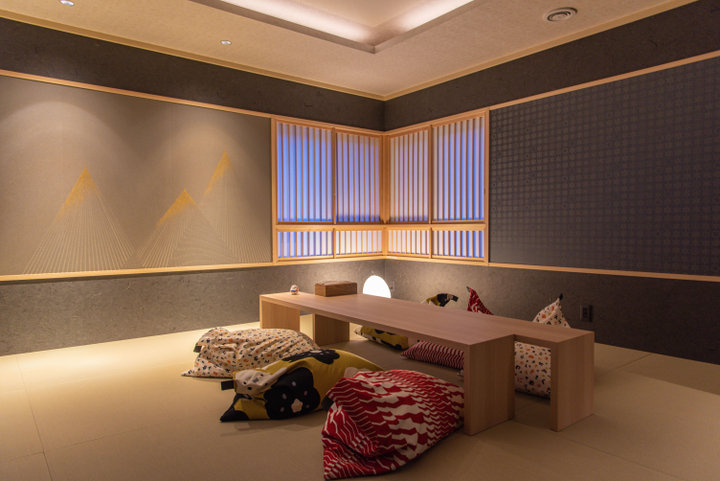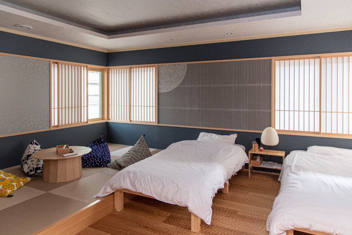 2Fのお部屋「雪」は、可愛い座椅子クッションが目をひく、広々とした畳の部屋。「月」のベッドと同じ、身体が喜ぶ天然素材の寝具を使用し、宿の名前でもある「眠」の質を高めています。旅を楽しむためには、ぐっすりと十分な睡眠を取れることはとても大事ですね。
