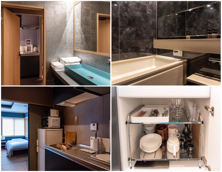 1Fのお部屋「月」は、小上がりの畳の間があるフローリングのお部屋。名栗フローリングと呼ばれる加工がされていて、脚触りがとても心地よいです。近江市場で食材を買ってきて、料理も楽しめるキッチンには、食器も揃っています。広々と脚が伸ばせるバスルームも和風のしつらえがとても素敵です。