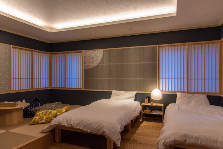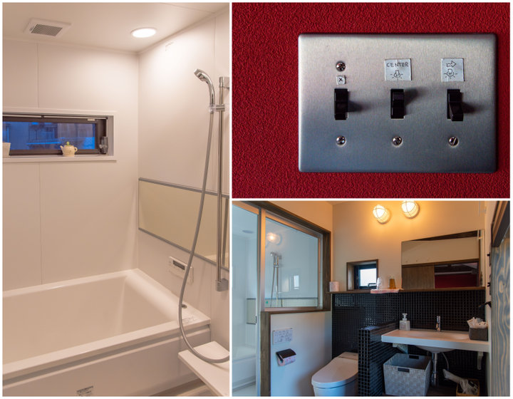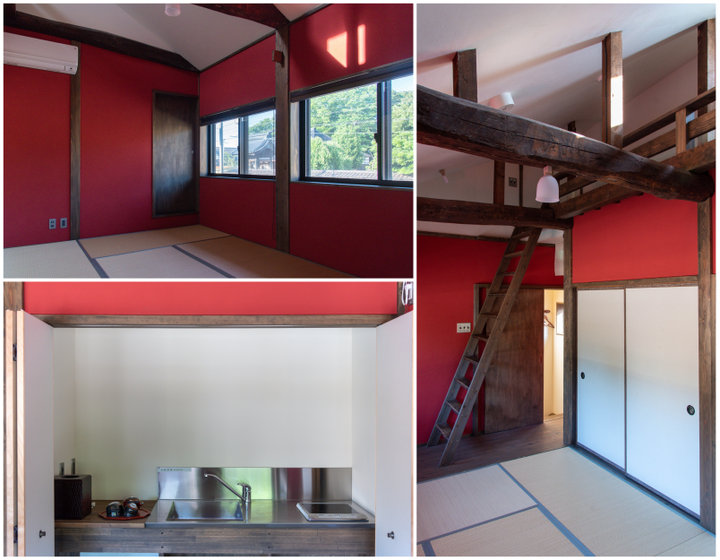 2Fに上がると、目をひく鮮やかな赤い聚楽壁塗りの壁が。赤は金沢のおもてなしの色とされ、改築前の梁を残した空間は、どこか懐かしく、手書きのスイッチの説明にもほっこりと温かい気持ちになります。バス・トイレなどは最新の設備を備えており、押入れを開けると簡易キッチンも。家族連れでも女子旅でも、もちろん一人旅でも、気兼ねなく快適に過ごせます。