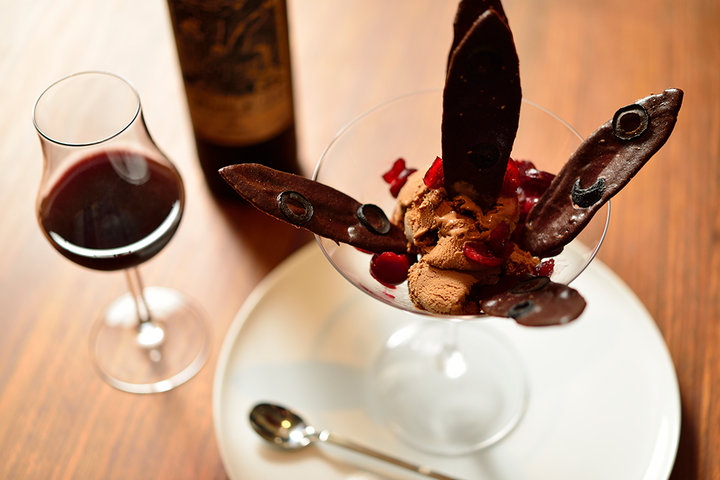 コクと酸味が感じられるチョコレートのアイスクリームはなめらかで軽やか。オリーブを散らしたチップスやベリーが好対照。これに合わせるバニュルスは、フレンチでいうところのソースの感覚。