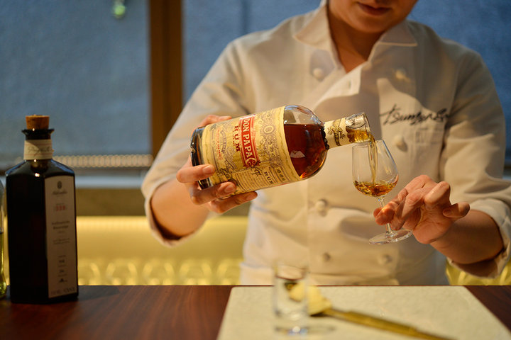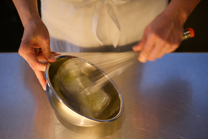 「でも私はですね、メレンゲを作るのが一番好きなんです。落ち着くっていうか……。昔から洗濯機がぐるぐる回っているのを見るのが好きだったので、もしかして攪拌(かくはん)作業は自分にとって精神安定剤みたいなものなのかも(笑)」と、ケラケラと笑いながら博多弁で話す香月氏。実際、泡立てている時は、手に余計な力や負荷はかかっていないのだそうです。ゲストと会話をしながらも、流れるような所作で泡立てを続けられるのも納得です。 彼女の作る「スフレ」は、砂糖の量が控えめ。これはワインやスピリッツなどとの相性を考えると、とてもバランスのいいことなのですが、実際のところ、メレンゲ作りに砂糖は不可欠なのです。多いほど早く泡立ち、膨らみのキープ力も高まります。けれど香月氏は、砂糖には頼りません。目指す味わいとマリアージュのためには、一つひとつ、そして一人ひとりのために、労力を惜しまないのが香月氏なのです。