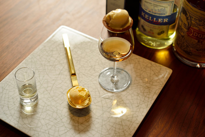 ロックフォールのアイスクリームは『ドン・パパ』とともに(右)。シェーブルのアイスクリームには『スティーレ・ミューレ』のアブサンとブラッド・オレンジの蒸留酒をふりかけていただく。香月氏曰く、『tsumons』4年間の集大成のスイーツに仕上がっている。