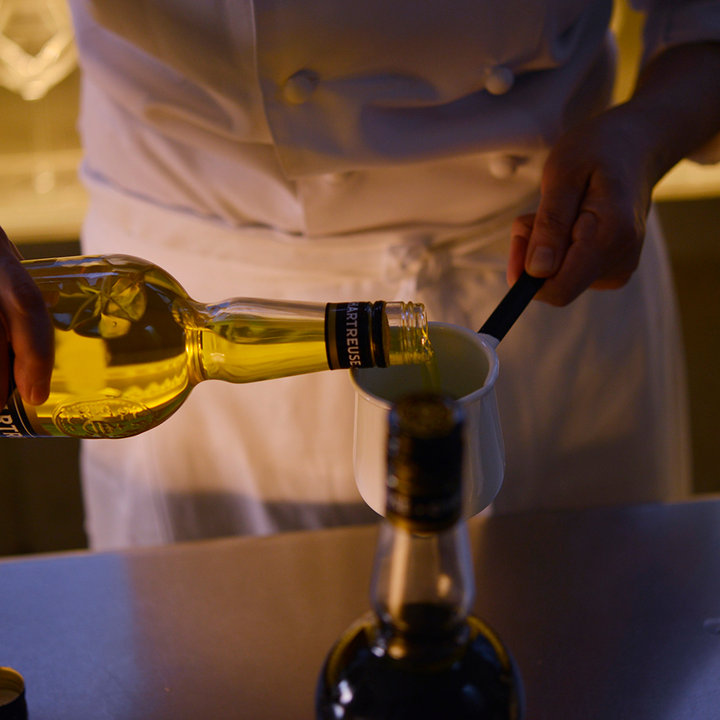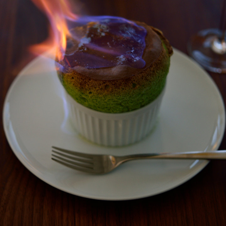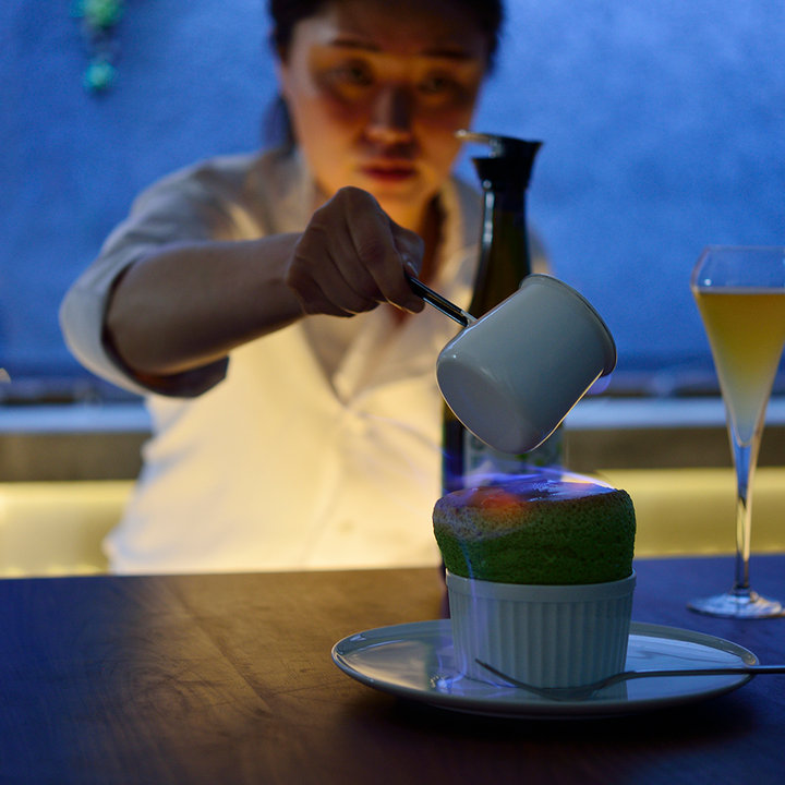 その次に登場したのは、森のように深い緑が迫り上がった抹茶の「スフレ」。これを、「もやし」にすると香月氏。メニューにも、「もやし」とあります。 「よくお客様に、もやしってあの“もやし”ですか? と目を丸くされるのですが、その反応が楽しくて。正解は“燃やし”、フランベにするんです」と香月氏。 話し切らないうちに、間髪入れずフランベにしたジンとシャルトリューズを、焼き上がった「スフレ」にさっと注ぎます。この瞬間、私たちゲストが「おぉ~」と声を上げるのは当然なのですが、実は香月氏自身が一番楽しそうなのです。まるで子供がいけない遊びをしているような、やんちゃな表情になっているのです。 香月氏は、抹茶という素材を草(=ハーブ)と捉えています。そしてフランベで使ったお酒も薬草香るリキュールとスピリッツ。そこへ合わせるのは、ほんのり青々しさを感じさせる、にごり系の白ワイン、ソーヴィニヨン・ブランです。 「もう、草草草! 草ワールドです」と香月氏。またしても彼女自身が誰よりも嬉々としているのが、印象的なのでした。