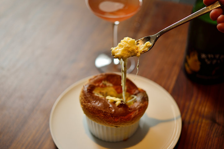 チーズの「スフレ」の中でも、モッツァレラを使ったものは特に面白いほど伸びる。日本のチーズと日本のワインは、そのまろやかな相性の虜となる。