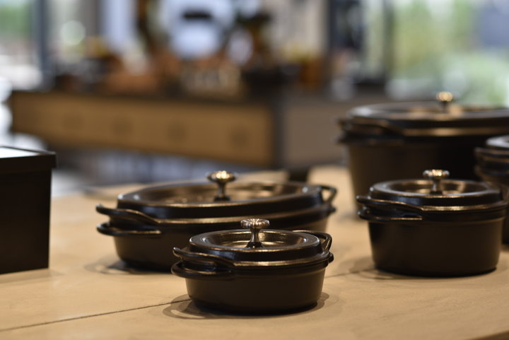 「スタジオエリア」に入ると、まず目に入るのがずらりと並んだバーミキュラ。大小さまざまなサイズはもちろん、オシャレなカラーリングの商品なども。さらに食パン専用のバーミキュラなど、ここでしか買えないビレッジ限定商品もあります。 商品が並ぶショールームにはキッチンもあり、「バーミキュラ コンシェルジュ」が使い方のコツやレシピを調理しながらデモンストレーション。購入前に実際に自分で使ってみることもできます。