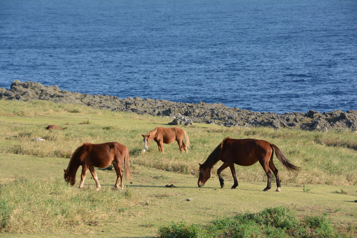 島にいくつかある牧草地帯では野生のヨナグニ馬に会える