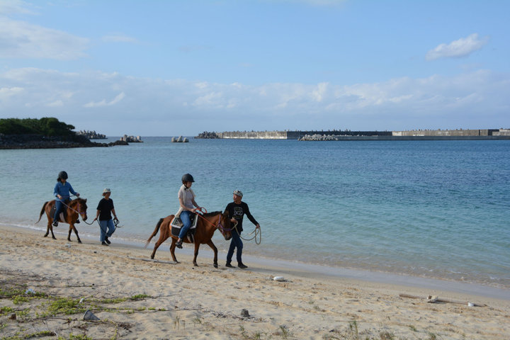 ヨナグニ馬の乗馬体験ができるのが島の中心、祖納(そない)集落にある「風馬(ふうま)」。ここでは自然放牧でケガをしたり病気になった馬を保護するとともに、そこから生まれた仔馬を育て調教しています。 メニューは、場内で約15分の乗馬体験を楽しむものから、引き馬で集落内や約10分離れたナンタ浜まで散歩する1時間~1時間半のコースなど。オススメはビーチライドが楽しめる「引き馬ナンタ浜コース」。 集落内のアスファルト道路を歩き、横断歩道を横切るときはちょっとドキドキしますが、ビーチに着くと乗り心地が格段にアップ。馬の背に揺られ、心地よい風に吹かれるひとときは、極上の癒しタイムといえるでしょう。