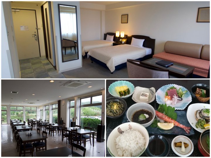 ツインタイプ中心の客室。ホテル内のレストランでは「島御膳」3700円(税込、前日までに要予約)を