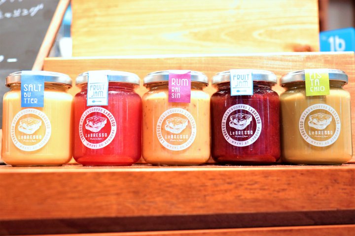 (左から)「塩バターミルクジャム」「アップルジャム」「ラムレーズンミルクジャム」「いちごジャム」「ピスタチオミルクジャム」(各870円)