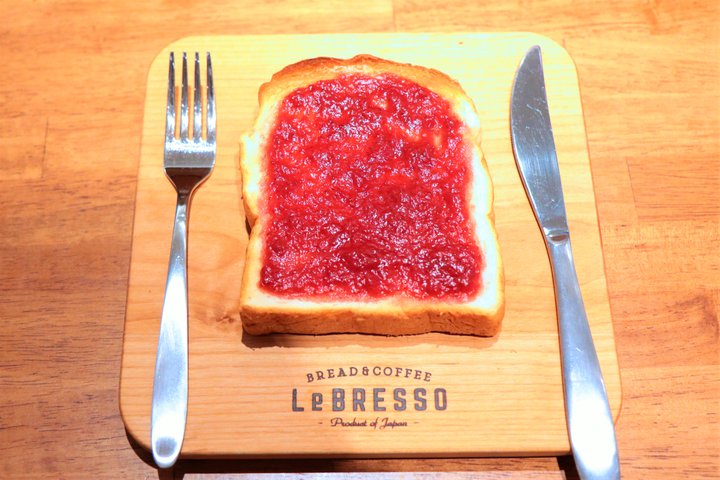 イートインのトーストはどれも大きめのウッドプレートにのり、ナイフとフォークでいただくので特別感があって気分もゆったりとしますね。 「あまおういちごジャム」には福岡県産のブランドいちご「あまおう」を贅沢に使用した保存料や着色用は不使用のジャムがたっぷり。フレッシュなイチゴの甘さが楽しめます。