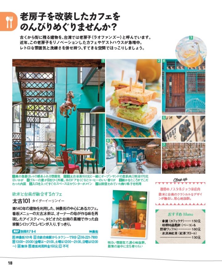 ノスタルジックな風情が漂う台南は、気ままに街歩きするのがおすすめ。最初の章ではそんな台南でめぐりたいスポットをご紹介。第2章では「台南にこそ台湾の美食あり」と言われるほどの魅惑的なグルメを特集。第3章では台南中心部からも行きやすい安平をはじめ、マンゴーの里・玉井など郊外へのトリップも掲載しています。