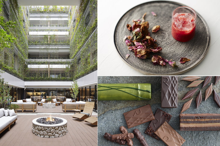 4階から9階は、年月を重ねて良くなるという“経年優化”への想いから天然素材にこだわったホテルで、天然木を基調とした内装でリラックスすることができます。ウェルカムスイーツもお楽しみ。 また、4階には、宿泊客以外も利用可能な中庭のほか、カフェ・レストラン&バー「Hyssop(ヒソップ)」も。ラグジュアリーな空間で、ヴィーガンの人も安心して食べられるメニューやボタニカルドリンクなどをゆったりと堪能できます。