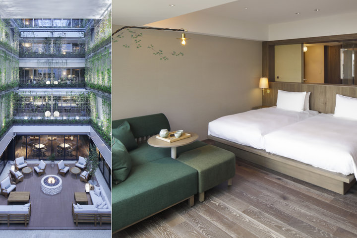 左:エントランスフロアの4階には吹き抜けの中庭が広がる 右: 宿泊は1泊1室55000円~