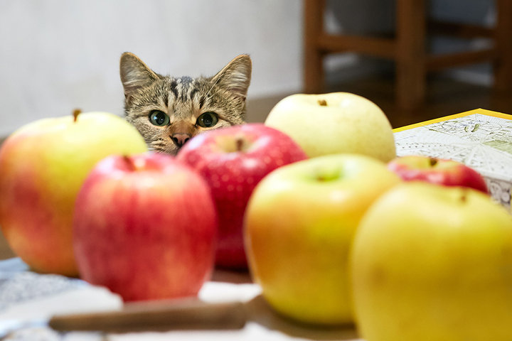 「ふじ」に「北斗」、「シナノゴールド」、「紅玉」、「スリムレッド」……メジャーからマイナーまで、さまざまな品種を栽培。のぞき見しているのは猫の「テン」。