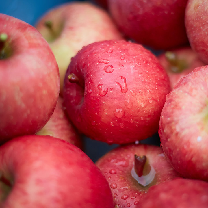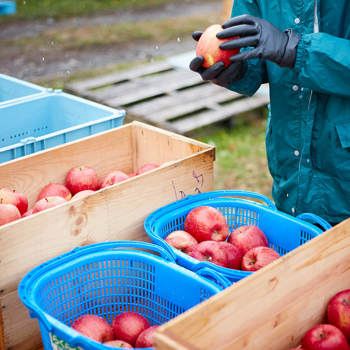 一般的なりんご農家が一気に収穫作業を進めるのに対し、「おぐら農園」では状態のいい実だけを選んでもいでいく「すぐりもぎ」方式。粒揃いのりんごとなる。