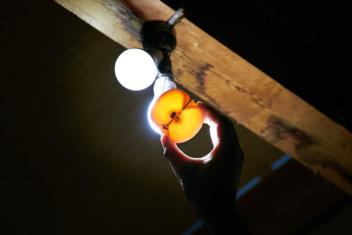 「今年のりんごは出来がよくて」。灯りにかざすと蜜部分が透け、りんご全体が黄金色に輝く。品種は「こうとく」。蜜が入りやすい品種だが、それにしても蜜だらけ!