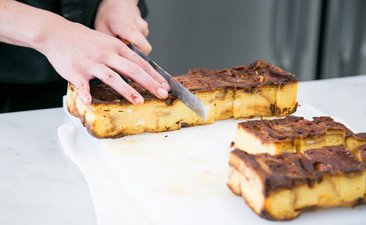 こちらのパウンドケーキ、実は小麦粉ではなくブリオッシュのパン粉で作っているそう! 「パウンドケーキは、バター、小麦粉、砂糖、卵の4つで完成します。小麦粉で作る場合、火を通すためにある温度まで上げる必要があるのですが、すでに火の通ったパン粉で作ることで、そこまで温度を上げずに、卵の温度に合わせて焼くことができるので、しっとりとしたパウンドケーキに仕上がるんです。ブリオッシュで作るパン粉には、牛乳やバターも含まれるので、通常のパウンドケーキよりしっとりしているのに重くないという不思議な触感を体験してもらえると思います」と塚本シェフ。