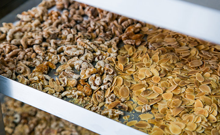 香ばしくローストしたくるみとアーモンド、これをキャラメリゼしてヌガーを作ります