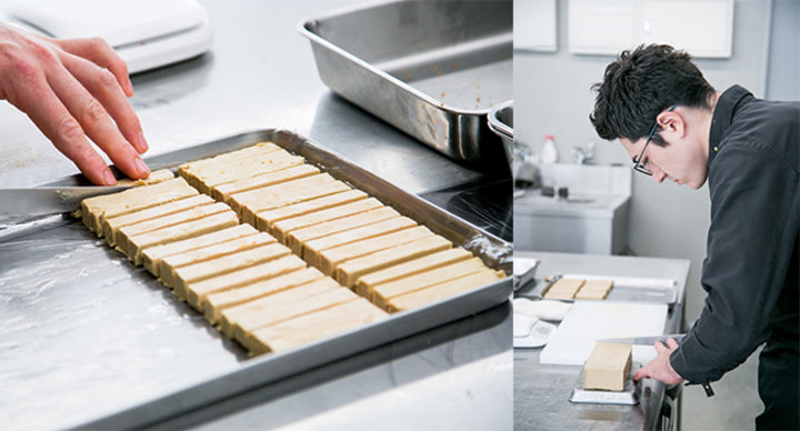 「フォアグラアイススティックの中身は、ほぼフォアグラです(笑)。ムースというとメレンゲや生クリームを加えたものを想像する方が多いですが、フォアグラアイススティックに関して言えば、空気を含ませているという点でふわっと柔らかいのでムースという言葉をあえて使っています。 味付けとしては、お酒を3種類使っていて、酒精強化ワイン*のマデイラやポートを使うことで砂糖の単純な甘さではなく、上品な甘さに仕上げています」。 このフォアグラに、キャラメリゼしたヌガーを細かく砕いたものをまぶして冷凍させ紙で包んで完成します。1本1本、丁寧に手作りされている「フォアグラアイススティック」は手土産にもぴったり。 *酒精強化ワイン…醸造過程でアルコールを加えることで、アルコール度数を高めたワイン。スペインのシェリー、ポルトガルのマデイラやポートワインが代表的。