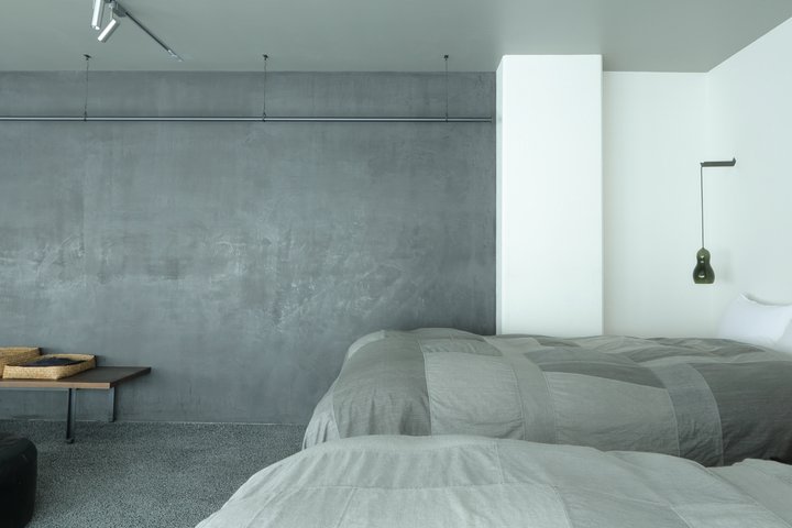 SUMI(墨)。左官仕事であえてムラを残して塗られたニュアンスのある壁の色が静かな時間を生み出す