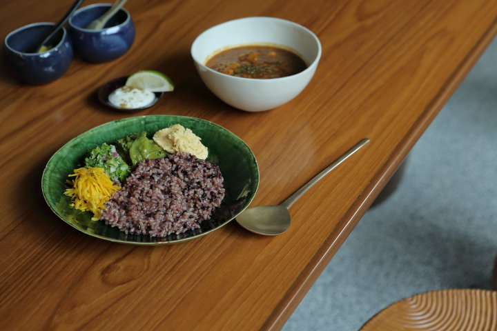 大きな窓からは朝の柔らかな光が降り注ぎ、とても静かで清々しい空気が漂っています。朝ごはんは東京・清澄白河にあるヨーガンレールの社員食堂から受け継いだベジタリアン料理。『MALDA KYOTO』では、近郊の畑から届くみずみずしく新鮮な野菜のもつ味わいを余すことなく生かした旬の料理がいただけます。一品一品、とても丁寧に作られていることが伝わる鮮やかな盛り付けやババグーリの器も目を楽しませてくれます。
