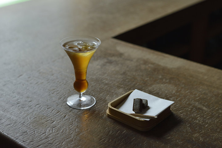 茶酒の一例、日本の薬草でつくる薬草茶を使ったカクテル。ダークラムのベースにアールグレイの香りを添えて。茶酒のあては豆乳ショコラ。